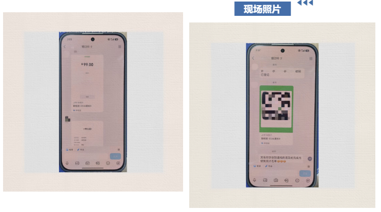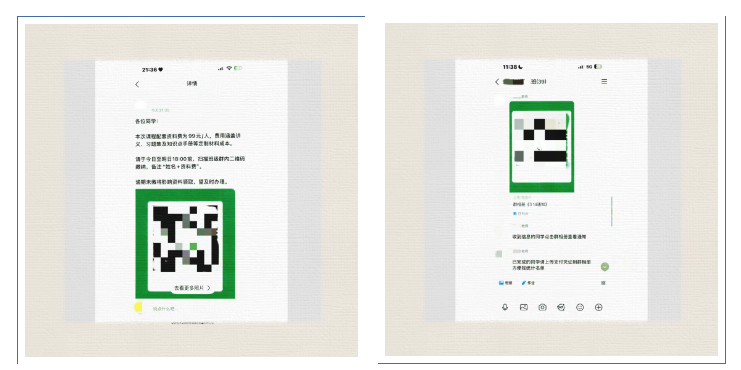 当晚骗子便冒用老师身份在群内发布消息:“各位同学,本次课程配套资料费为99元/人,费用涵盖讲义、习题集等定制材料成本,请于今日至明日18:00前扫描班级群内二维码缴纳,备注‘姓名+资料费’,逾期未缴将影响资料领取,望及时办理。”并随消息附上一张收款二维码。