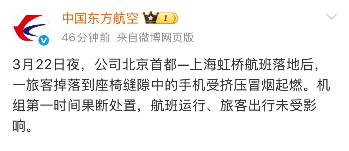 3月23日,中国东方航空发布情况通报称,公司北京首都—上海虹桥航班落地后,一旅客掉落到座椅缝隙中的手机受挤压冒烟起燃。