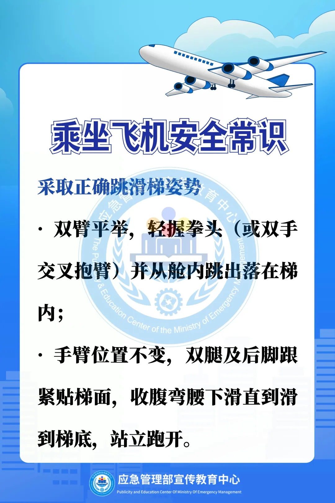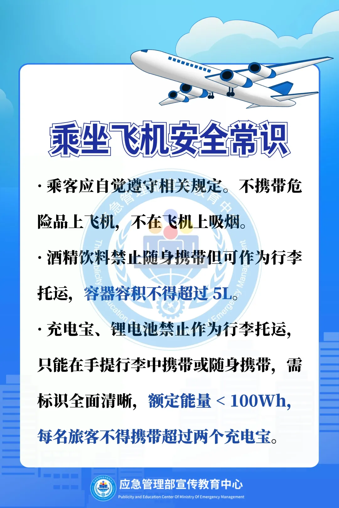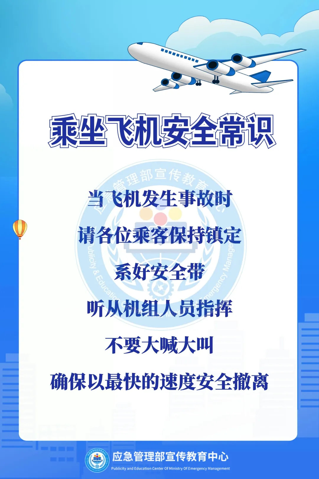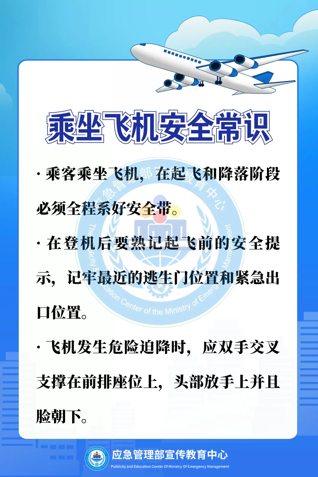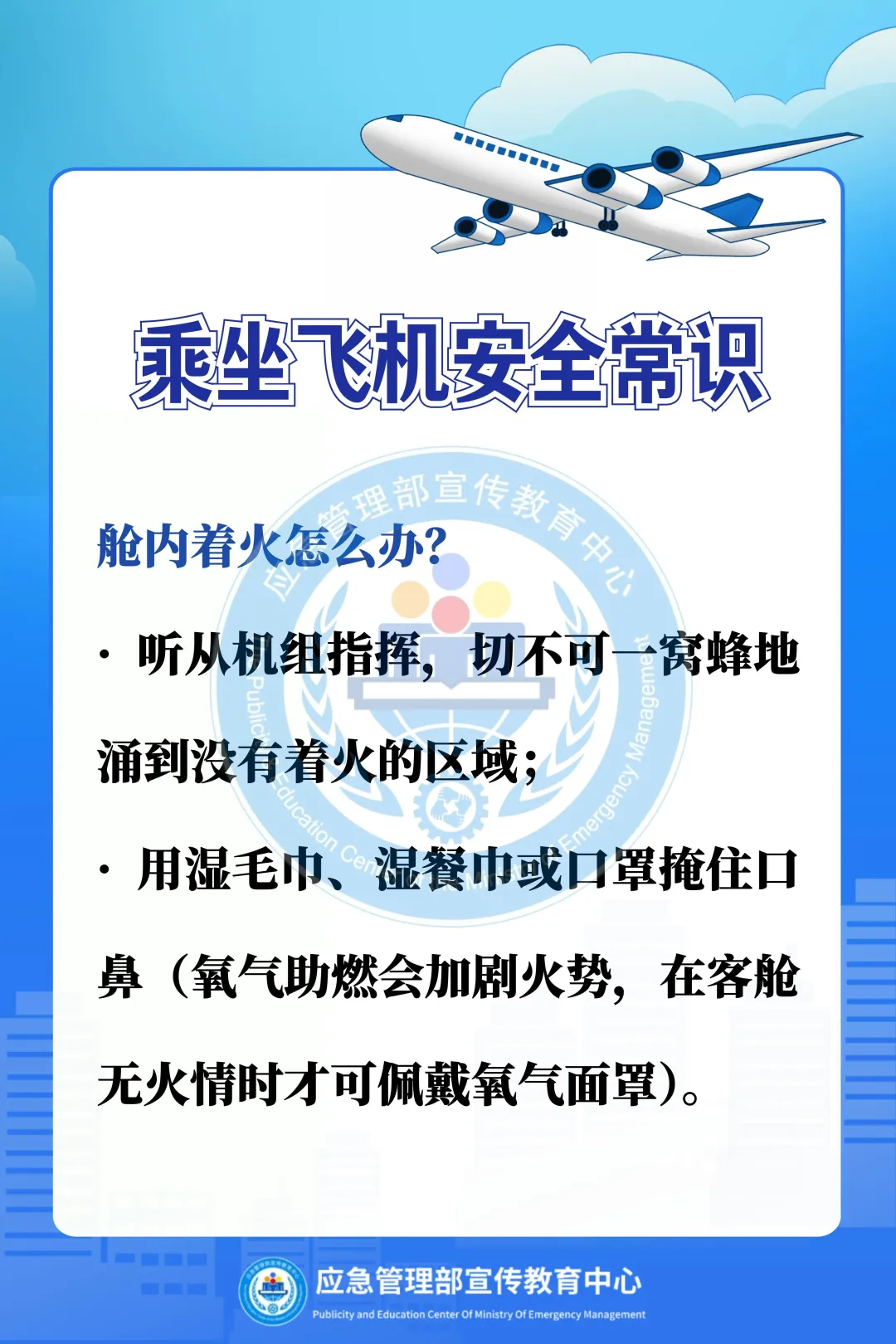 阿消提示:乘坐飞机出行,切勿携带易燃易爆等违禁品,认真听取安全须知,熟悉应急出口,遇机舱火情,听从指挥,有序撤离,这份乘机消防安全指南请收好。