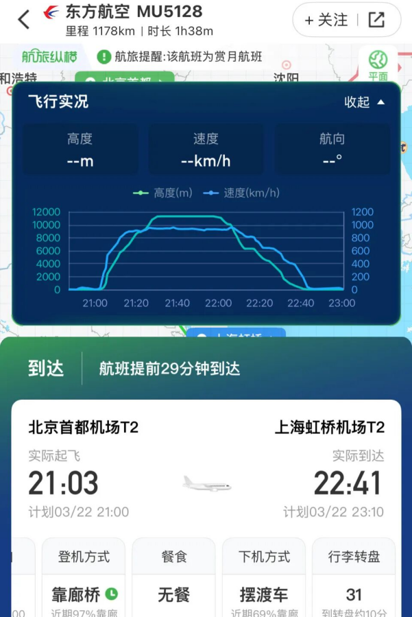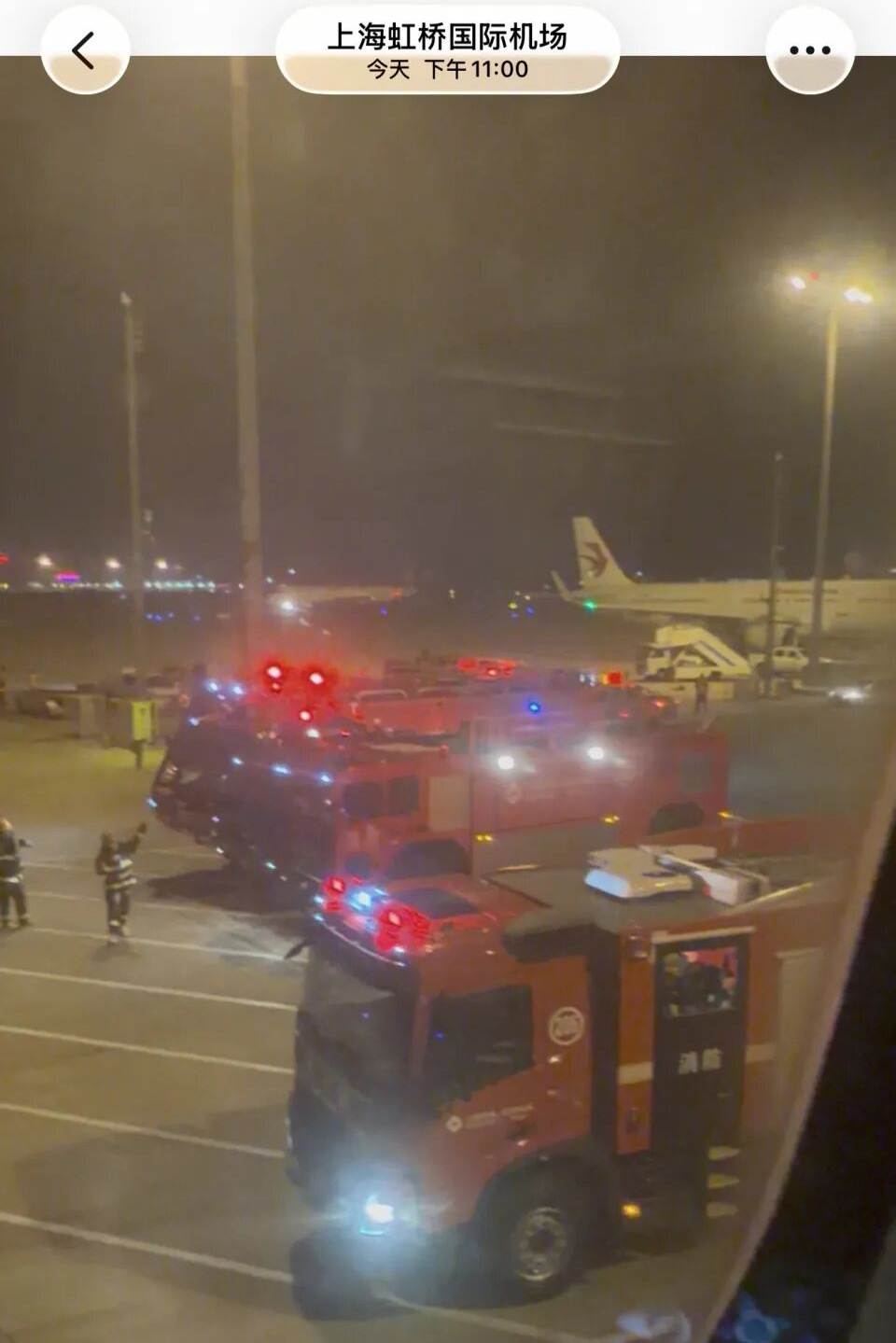 3月22日晚,有乘客在社交媒体晒出东航MU5128航班落地上海虹桥机场后,机舱内出现火情,机组人员迅速灭火。通过该乘客晒出的照片可以看到机舱外还停着多辆消防车。记者查询航旅纵横看到,MU5128航班昨天21:03从北京首都机场起飞,于22:41落地上海虹桥机场。